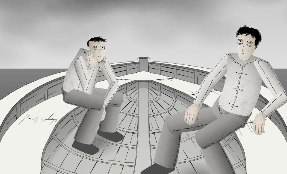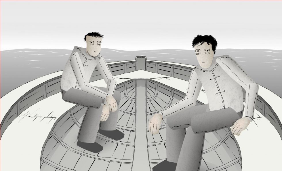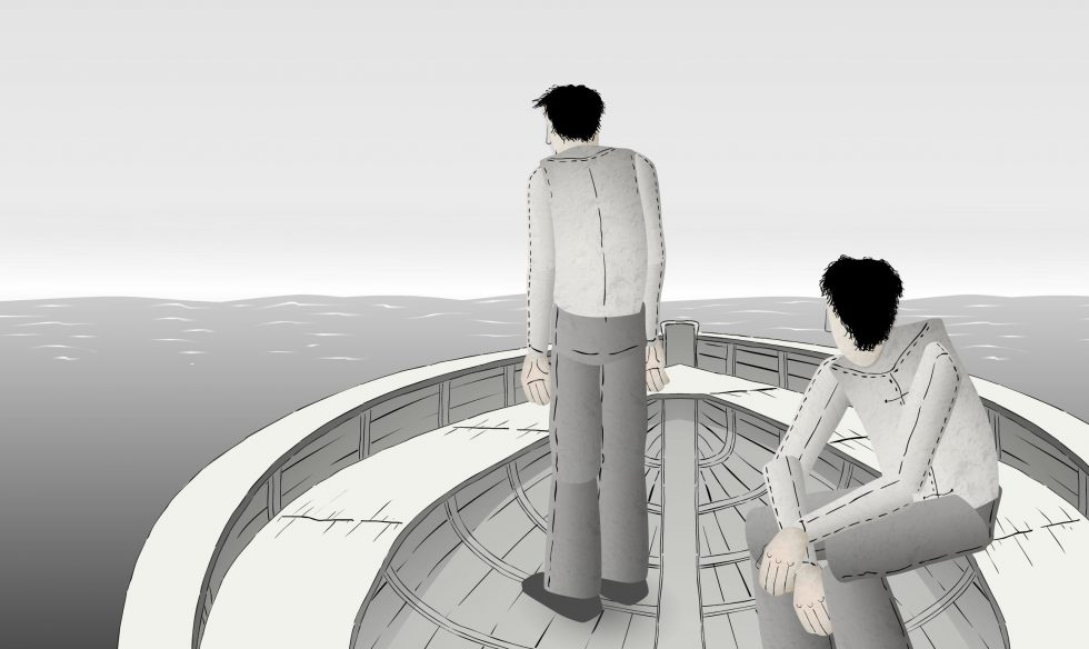 The first of a series of experiments with filmic composition, Rendition:Rift is a 2D interactive media piece that explores how the player might impact events of the narrative by shifting what is in view. By virtue of altering the framing, thereby establishing a slightly different narrative focus, the player could indirectly interact with storyworld characters. Within the setting of Rift the user is in a wooden lifeboat opposite two unknown individuals, adrift at sea. The backstory is purposefully ambiguous, emphasizing instead the conditions that press physically and psychologically on their apparent present circumstances. The simple interaction gives the user opportunities to interpret the changing states of the storyworld. Installed in the Digital Arts Research Center, UC Santa Cruz, as part of the Playable Media Arcade.